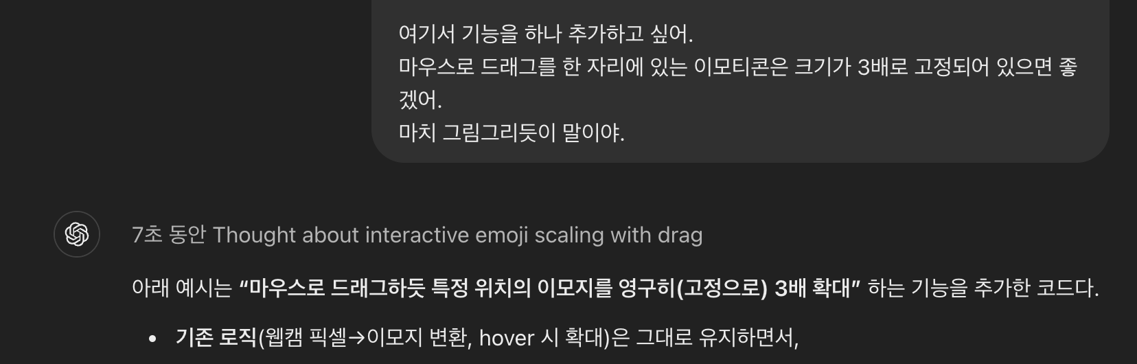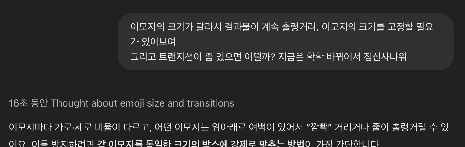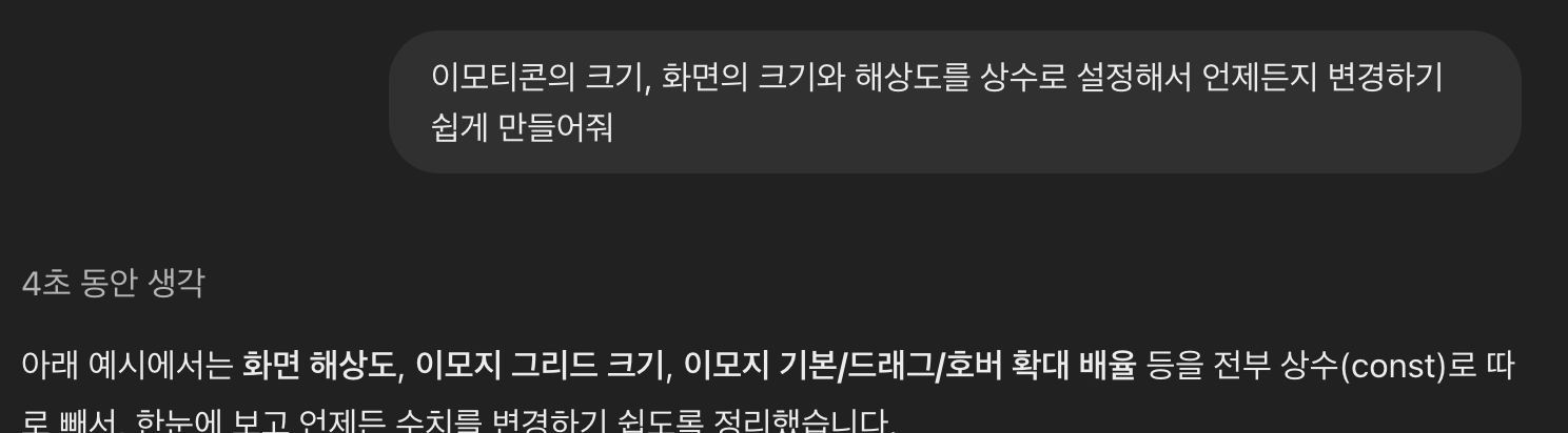 이건 내 아이디어야. 웹캠을 켜고 색상에 따라 이모지로 변환해서 보여주는 건 어떨까? 예를 들어 노란색이면 '🙂', 초록색이면 '💚' 이런식으로 색상을 이모지로 변환해서 일종의 아스키 아트를 만드는거지. 그리고 마우스 인터랙션도 추가해서, 마우스 위치에 있으면 그 주변의 이모지 크기가 2배는 커지는거야.GPT의 답변을 보고 영감을 받아 다시 대화를 나눈 프롬프트